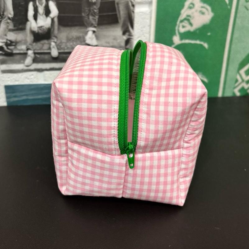 Handmade makeup bag, cube makeup bag, gingham makeup bag, small travel bag, zipper pouch, toiletry bag, gift for her, travel organizer, handmade pouch, checkered makeup bag