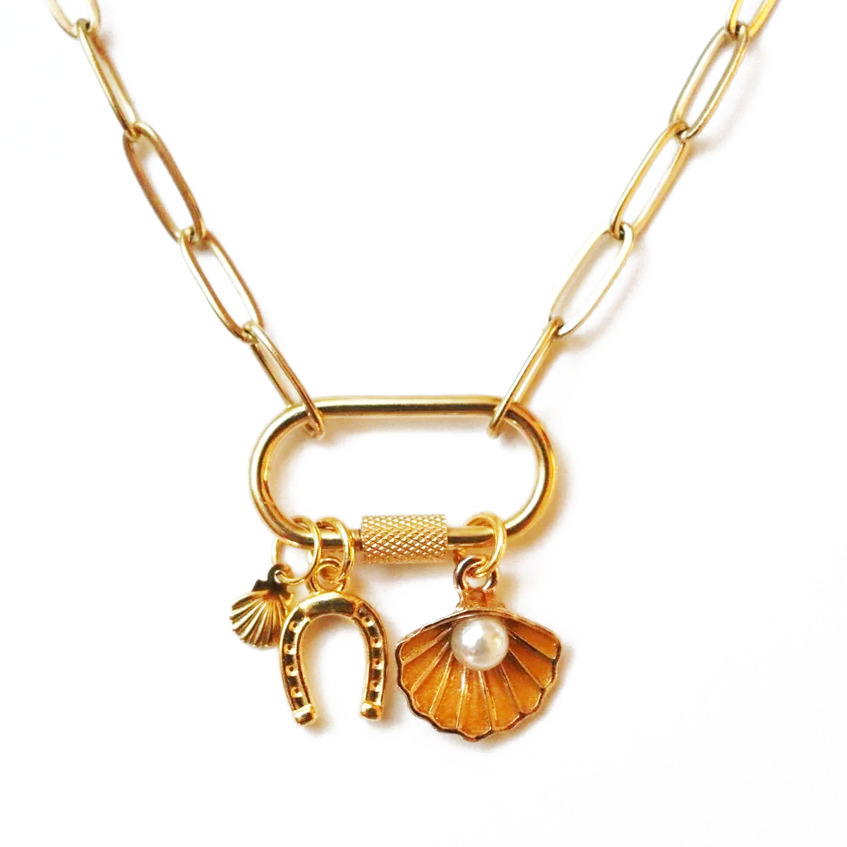 Charm necklace, gold necklace, gold charm necklace, seashell charm necklace, horseshoe charm necklace, shell charm necklace, gold jewelry, handmade gold necklace, gold jewelry, adjustable gold necklace, 18-inch gold necklace, charm necklace for sale, gold charm necklace, seashell jewelry, horseshoe jewelry, shell jewelr